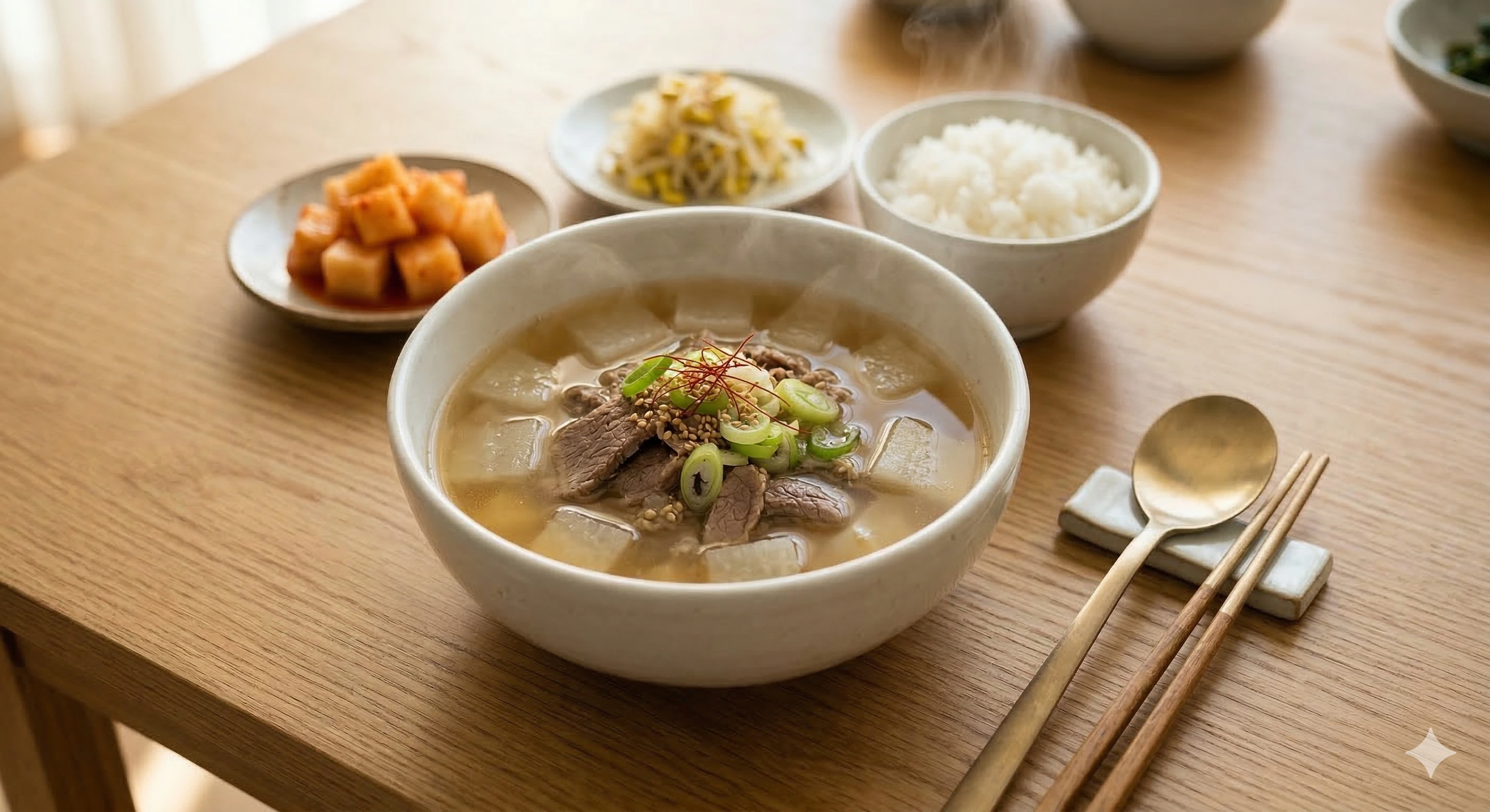 - [핏물 제거 — 맑은 국물의 핵심] 소고기를 찬물에 30분간 담가 핏물을 충분히 제거합니다. 물이 붉게 변하면 한 번 갈아주는 것이 좋습니다. 이 단계를 생략하면 국물이 탁해지고 잡내가 남습니다.